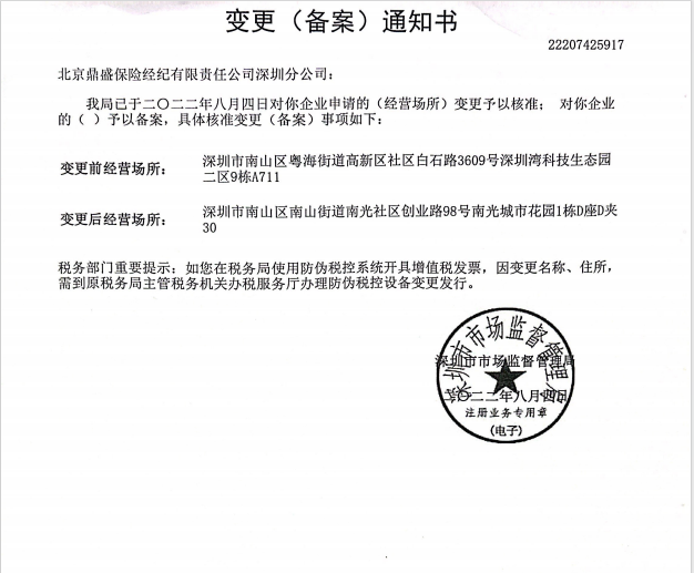 北京鼎盛保险经纪有限责任公司深圳分公司于2022年8月4日经深圳市工商行政管理部门办理了机构住所地址变更登记并领取了营业执照,变更前后信息如下: